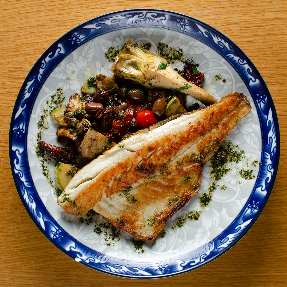 /seabass fillet, zucchini, cherry tomatoes, capers, sun-dried tomatoes, artichoke, Taggiasca olives, olive oil, garlic, thyme, pesto/