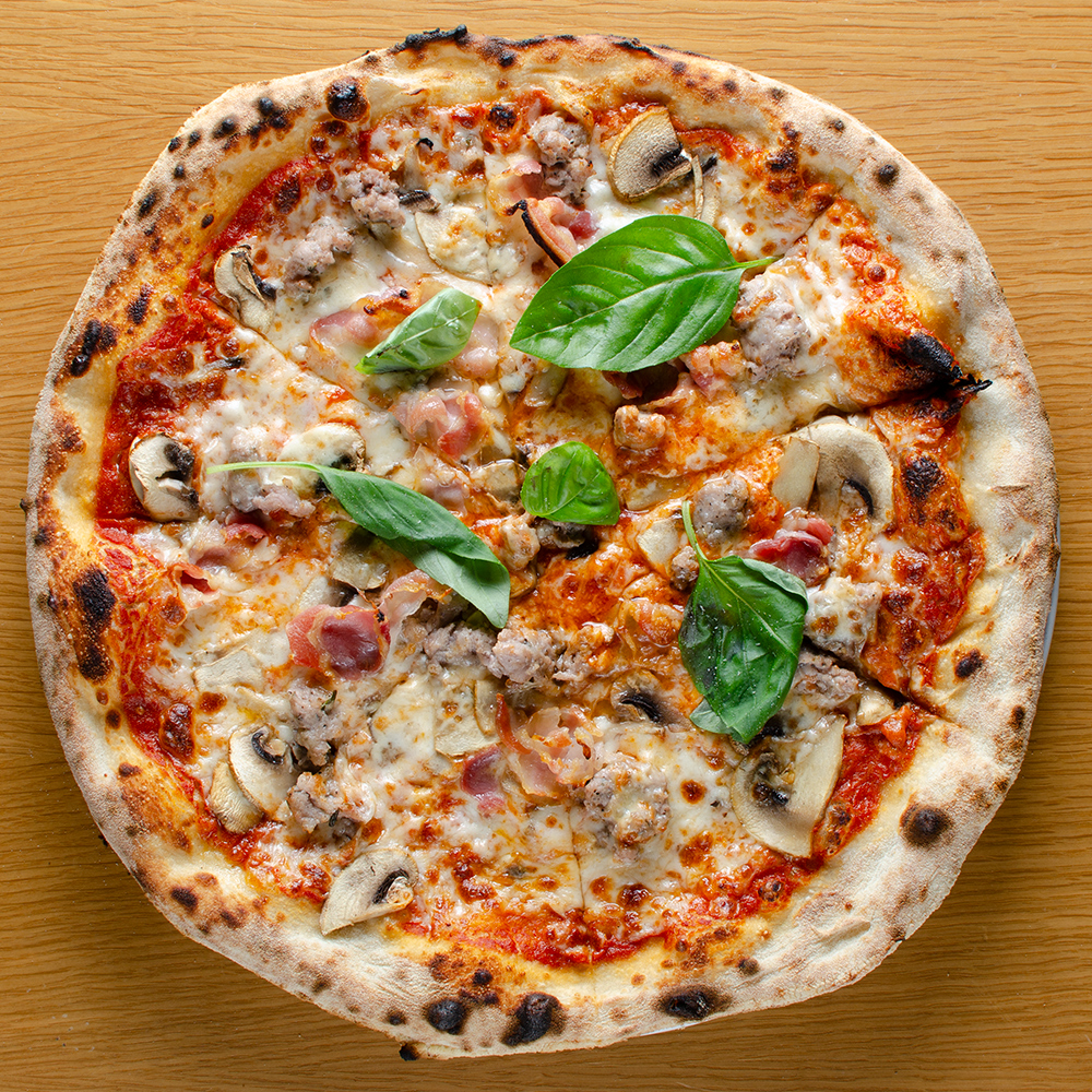 /tomato sauce, mascarpone, mozzarella Fior Di Latte, homemade salsicce, pancetta, mushrooms, smored scamorza, basil/