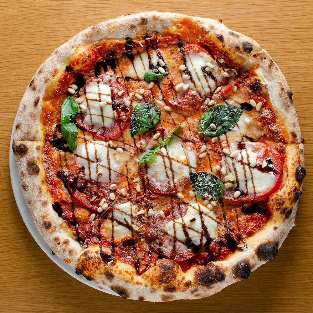 tomato sauce, buffalo mozzarella, tomatoes, balsamic glaze, Parmigiano Reggiano aged 24 m., basil, pine nuts