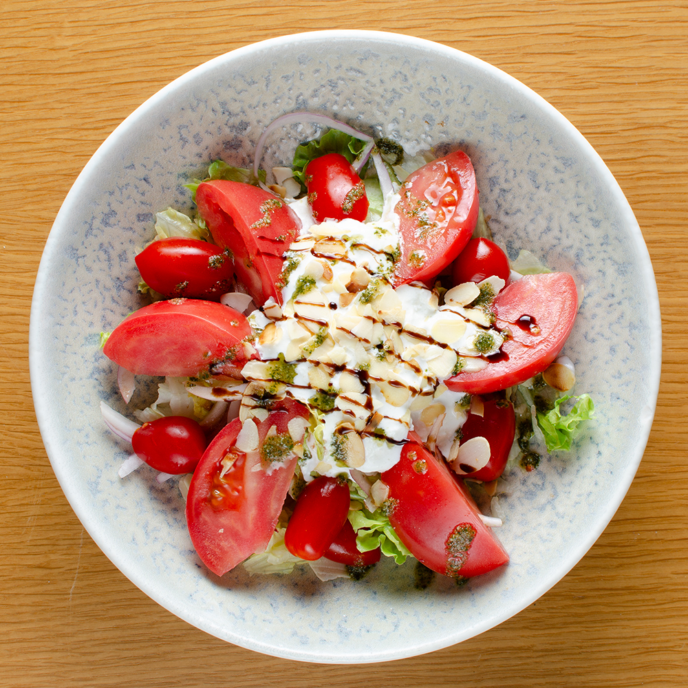 tomatoes, cherry tomatoes, lettuce, almonds, stracciatella, red onions, balsamic vinegar, Maldon salt