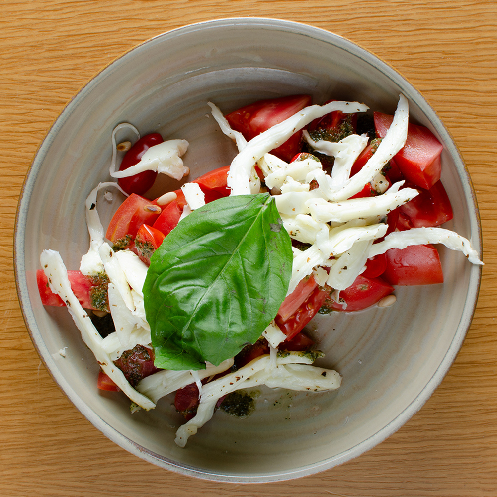 marinated mozzarella Fior di Latte, pink and cherry tomatoes, basil, pine nuts, homemade Pesto