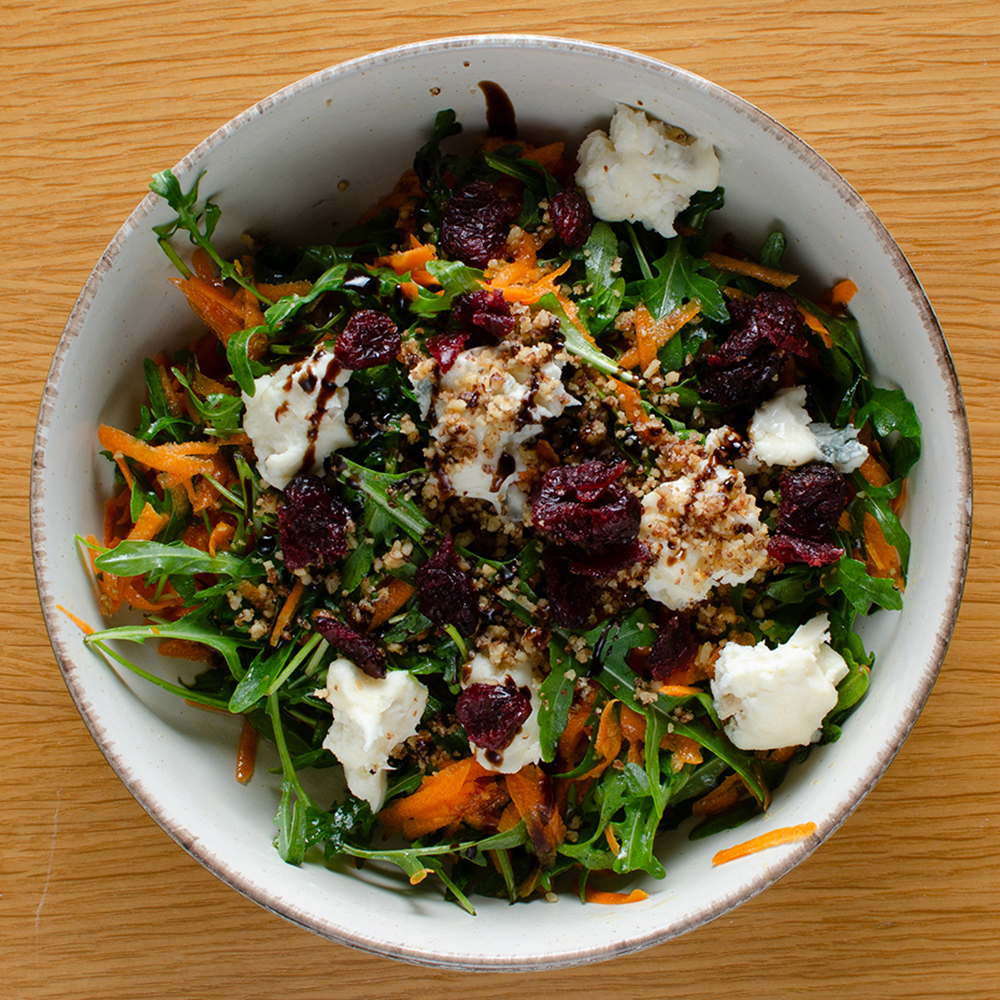 Carrots, creamy gorgonzola, caramelized walnuts with truffle, dried fruits, arugula