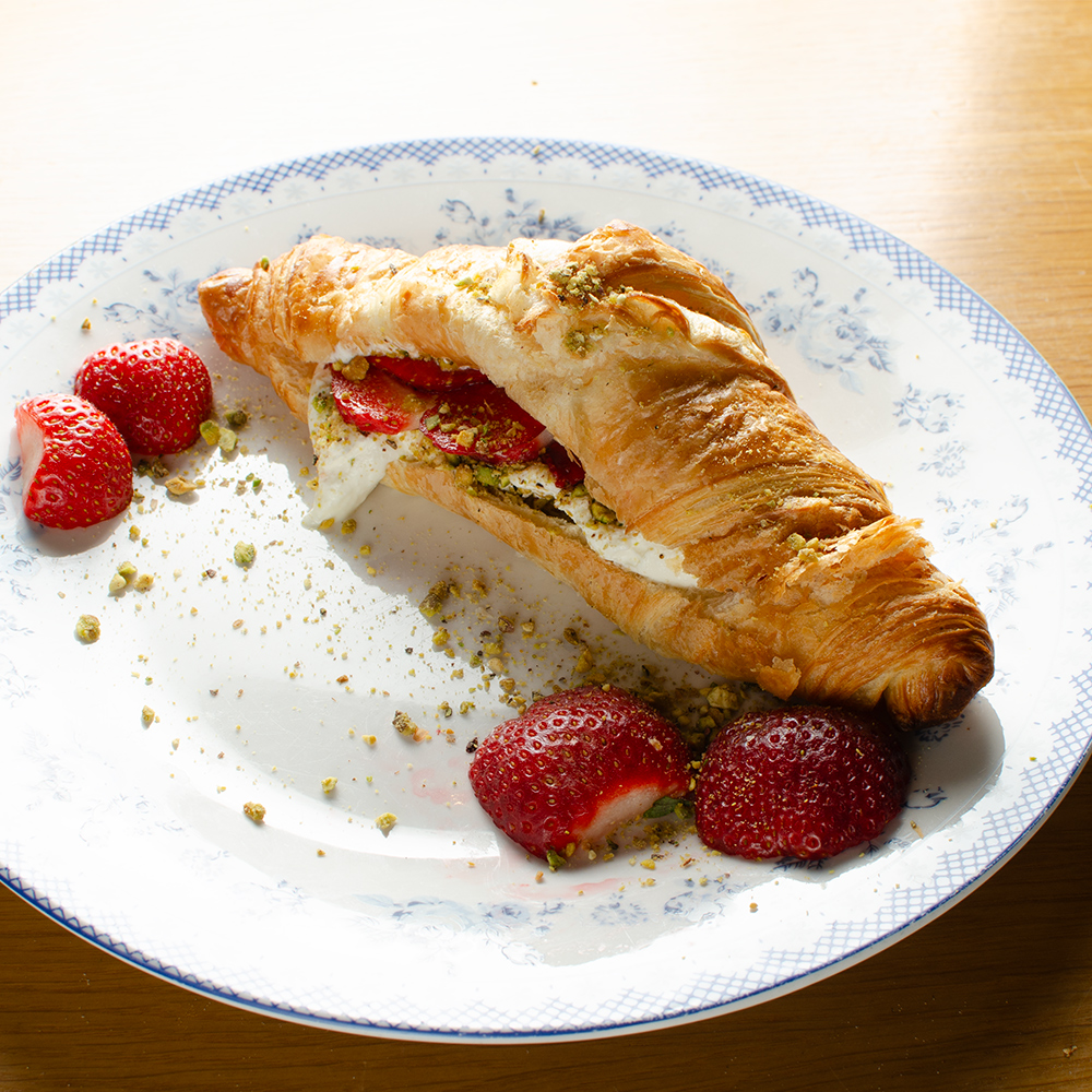 with STRAWBERRIES, mascarpone, chocolate spread, pistachio, gelato