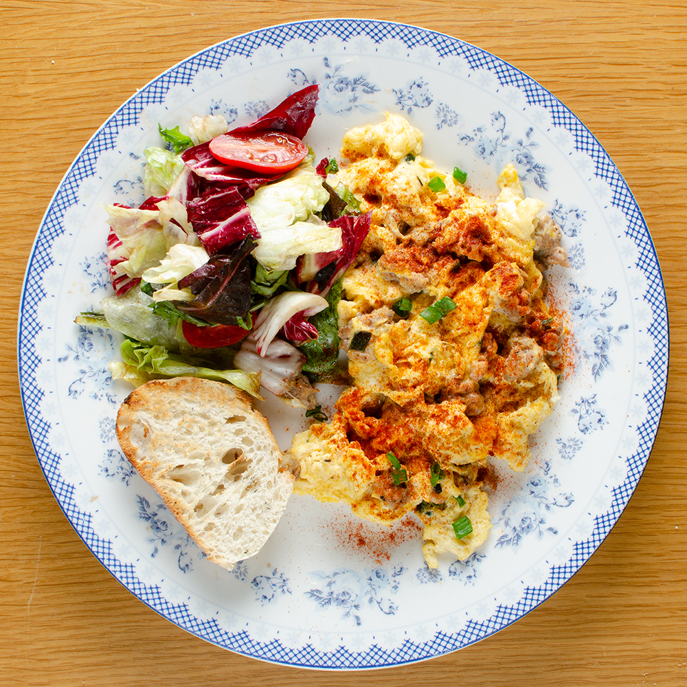 sour cream, mixed salads with cherry tomatoes, green onion, bruschetta
