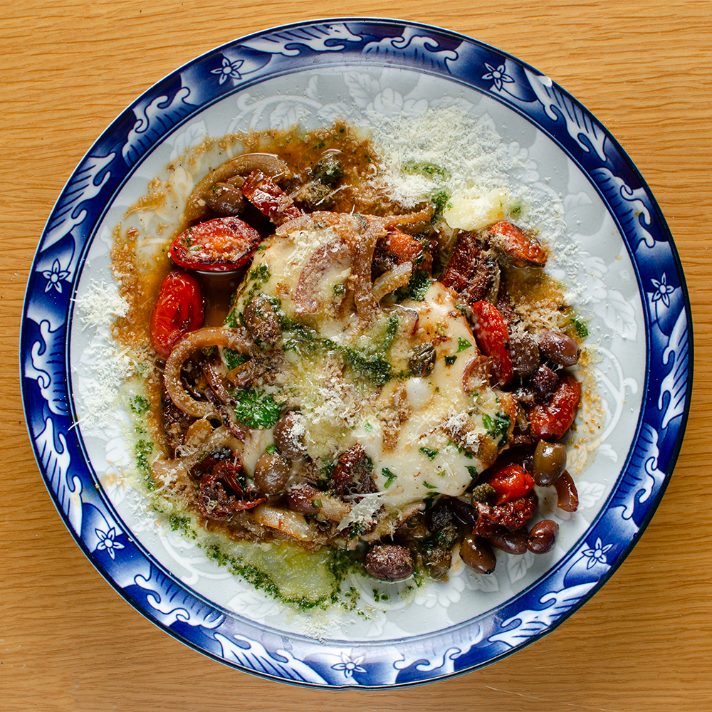 chicken fillet, mozzarella, cherry tomatoes, olives, capers, red onion, garlic, wine, parmesan, basil, pesto