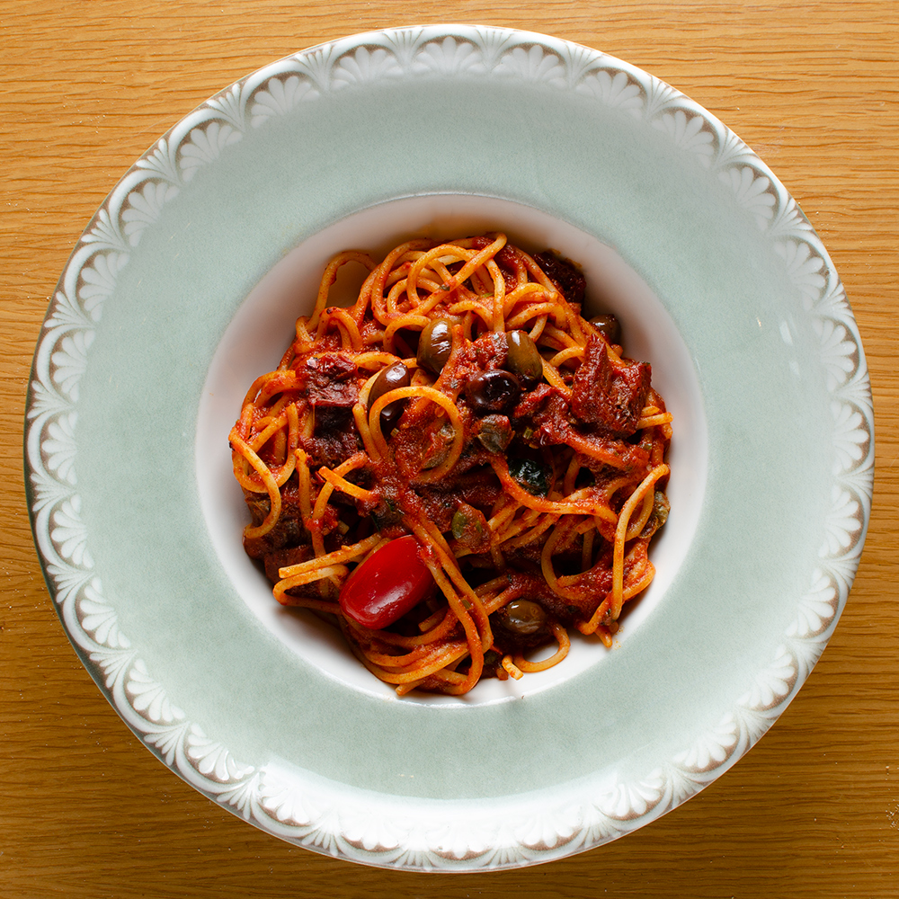 cherry tomatoes, capers, sun-dried tomatoes, Taggiasca olives, chili, basil, parsley, tomato sauce, wine, olive oil