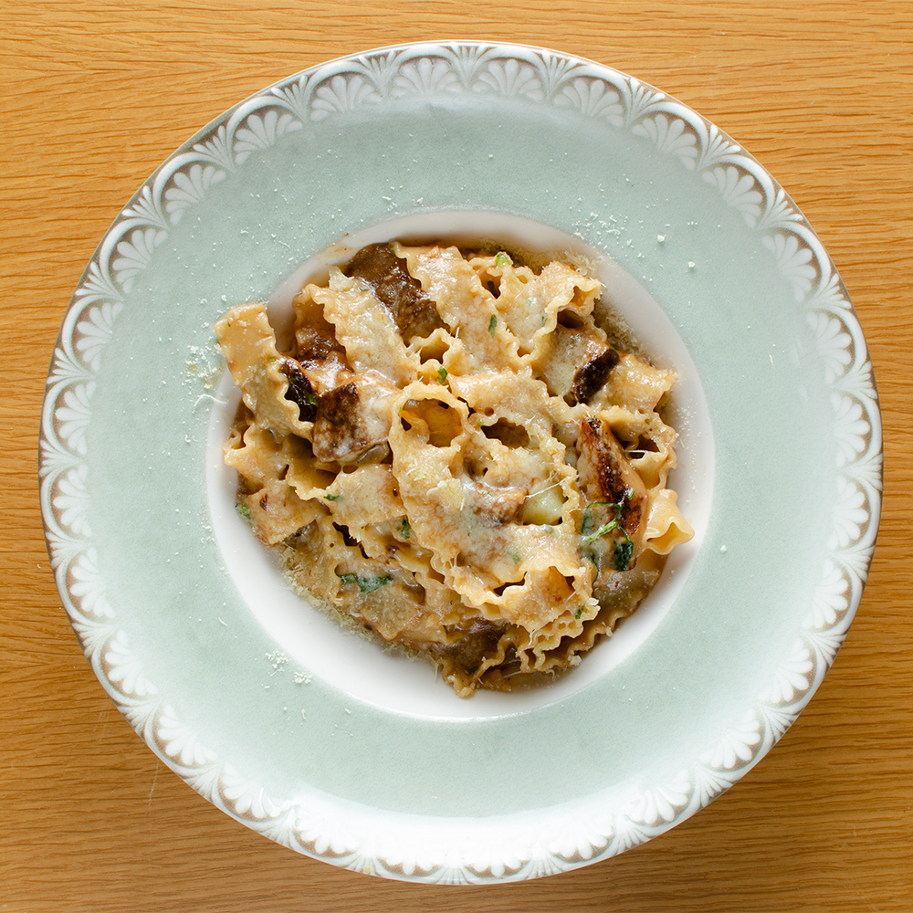 Mafaldine, porcini mushrooms, thyme, Parmigiano Reggiano aged 24, garlic, wine, parsley, cream, Demi-glace sauce