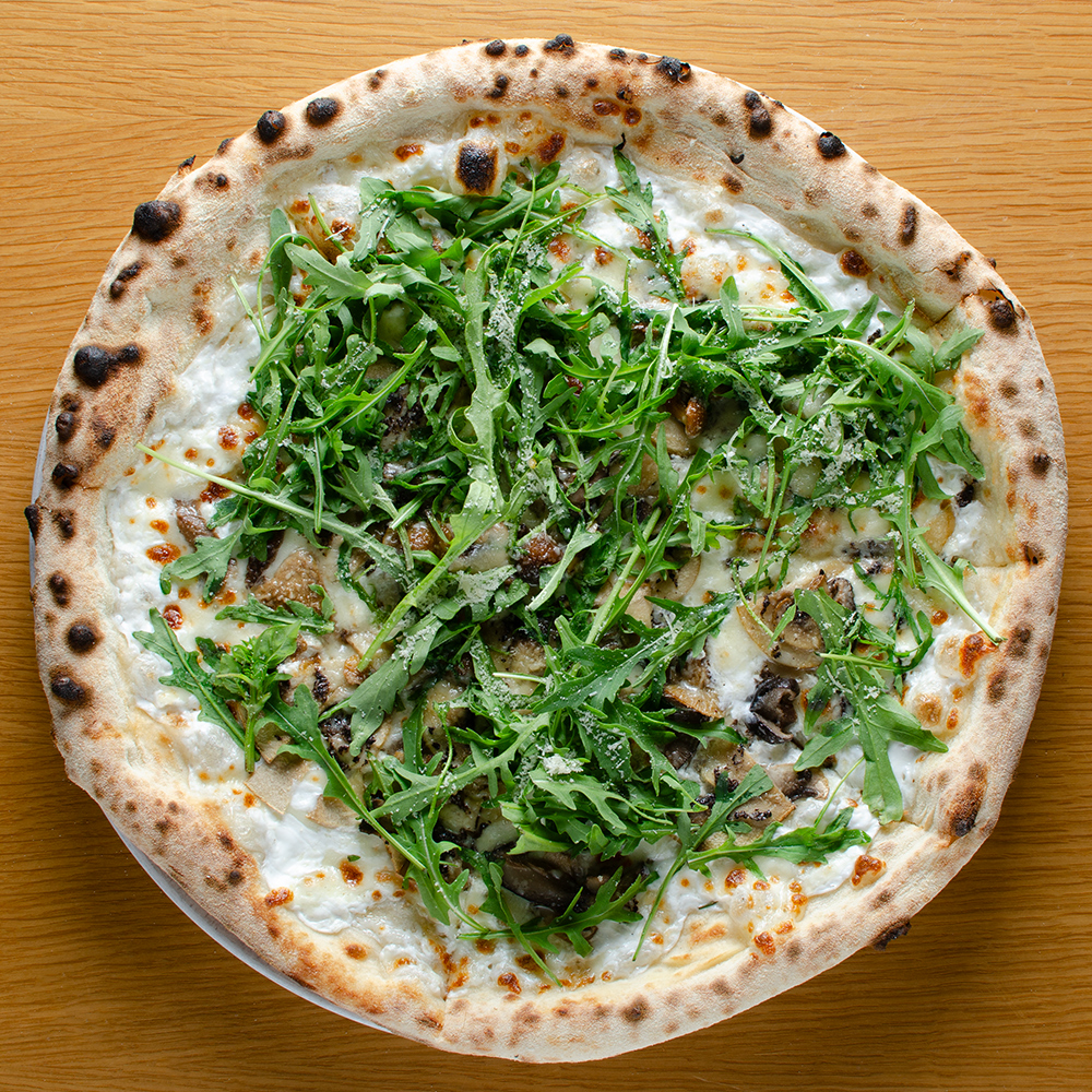 Mozzarella Fior di Latte, mascarpone, wild mushrooms, Parmigiano Reggiano aged 24 months, truffle paste, arugula, olive oil