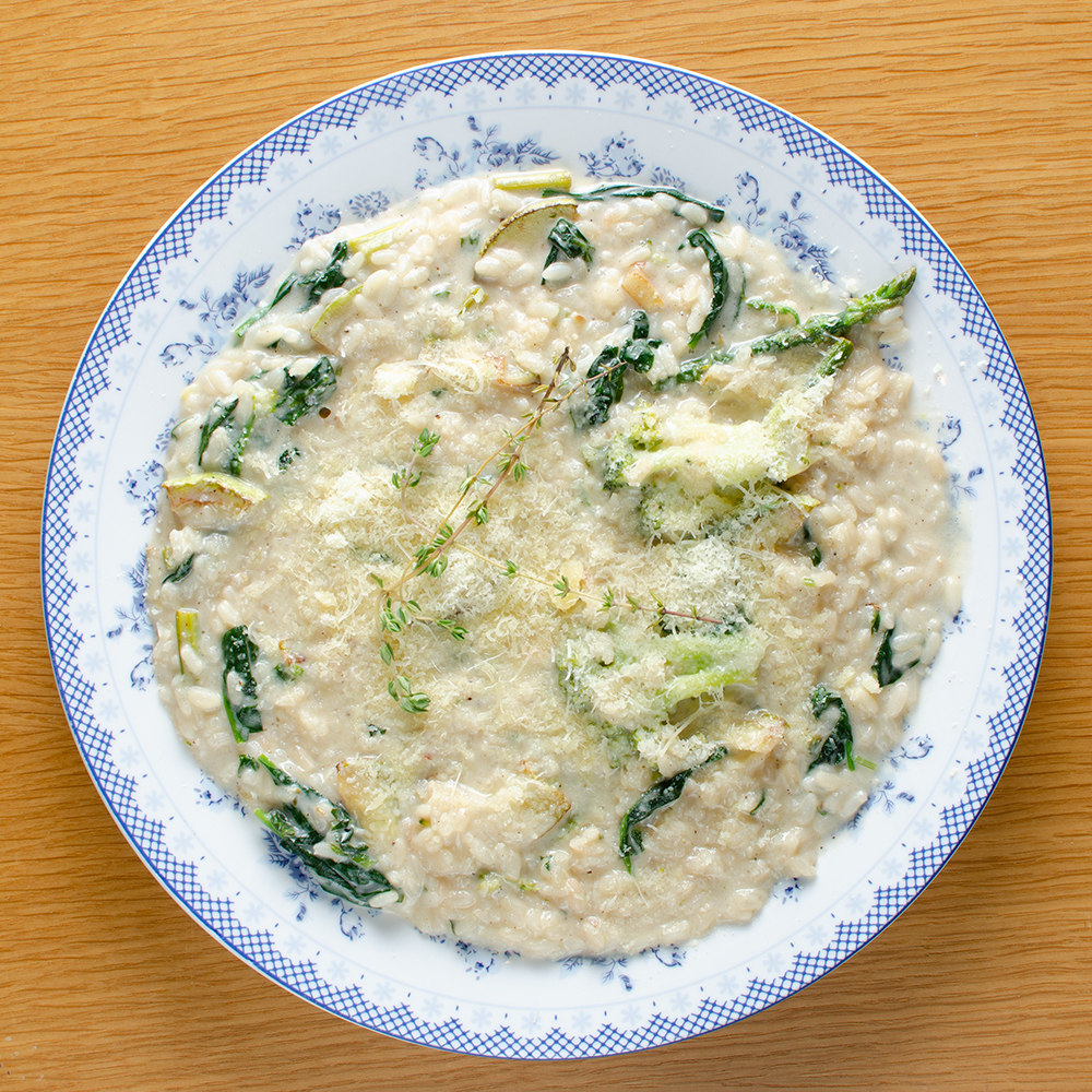 asparagus, broccoli, zucchini, baby spinach, cream, parsley, thyme, garlic, Parmigiano Reggiano aged 24 m., wine, butter