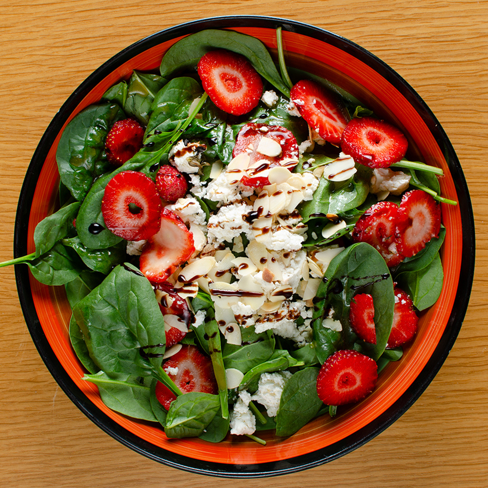 baby spinach, roasted cow cheese, strawberries, almonds, honey - raspberry dressing