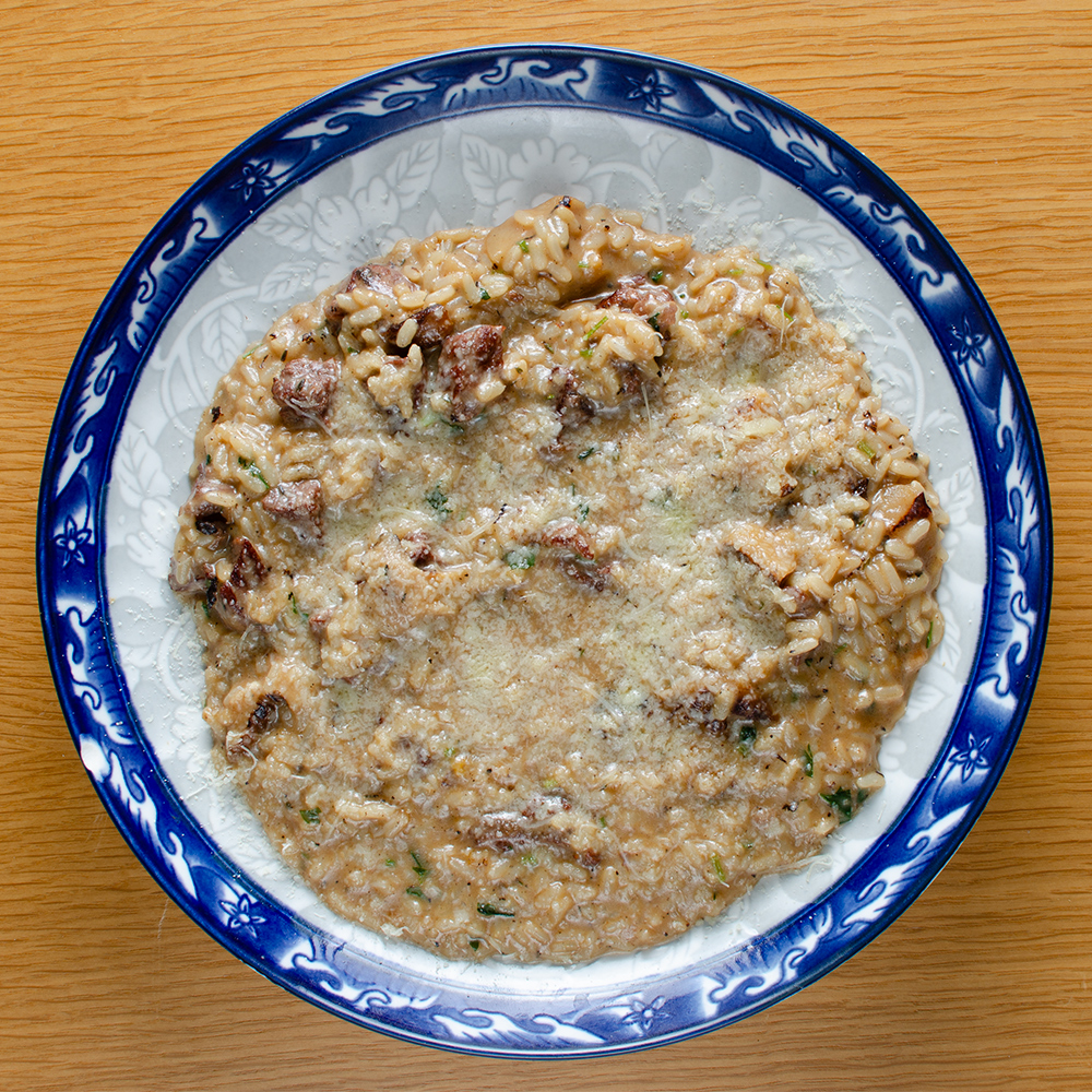 телешко, манатарки, сос Демиглас, магданоз, Пармиджано Реджано зряло 24 месеца, вино, масло