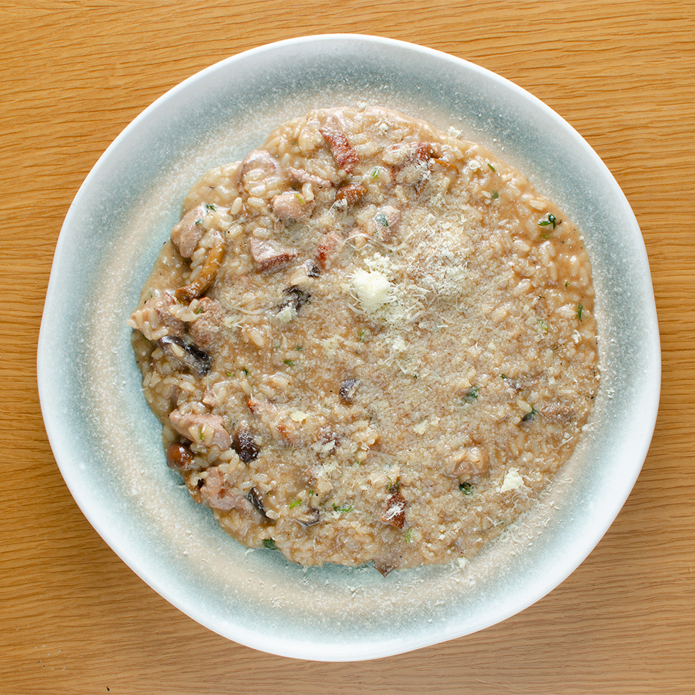 свинско бонфиле, горски гъби, сметана, Пармиджано Реджано зряло 24 месеца, вино, масло, магданоз, мащерка