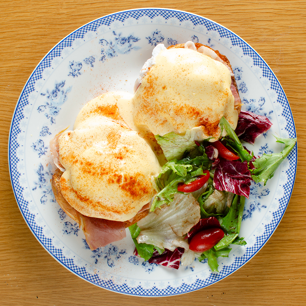 Прошуто Сан Даниеле, две поширани яйца, домашен сос Холандез, микс салати с чери домати, бриош