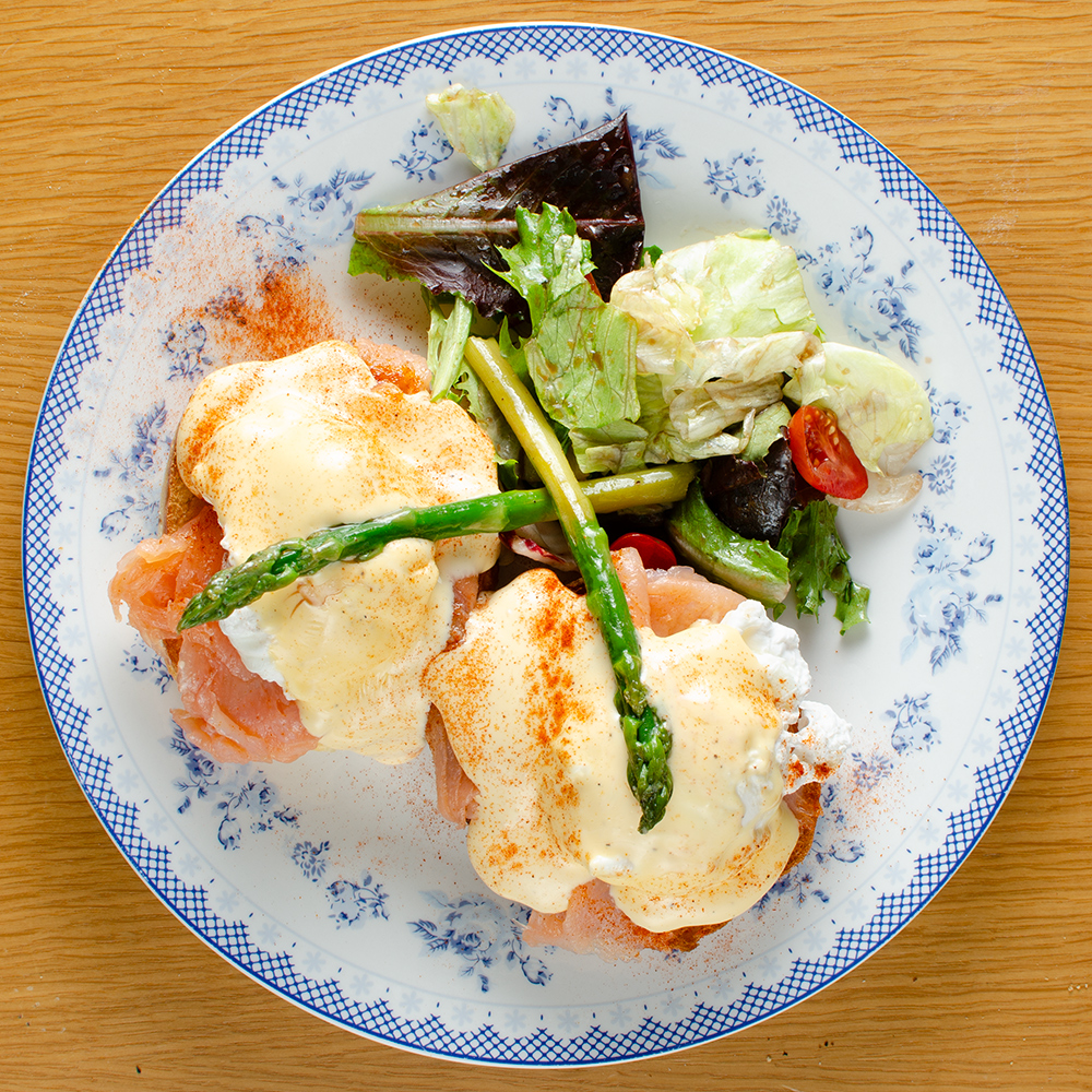 дoмашно маринована сьомга, аспержи, две поширани яйца, домашен сос Холандез, микс салати с чери домати
