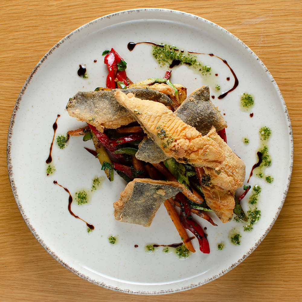 филе от пъстърва, тиквички, чушки, моркови, чесън, мащерка, сос Песто