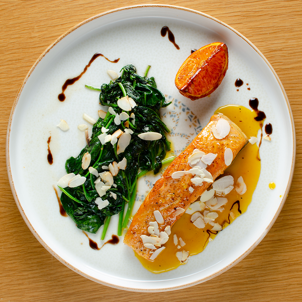 сьомга филе с портокалов сос, мед, бейби спанак, филирини бадеми, вино