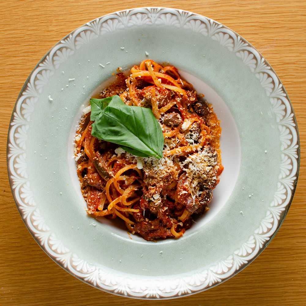 патладжан, биволска моцарела, маслини Таджаска, Пармиджано Реджано зряло 24 месеца, червен лук, чесън, доматен сос, босилек, вино