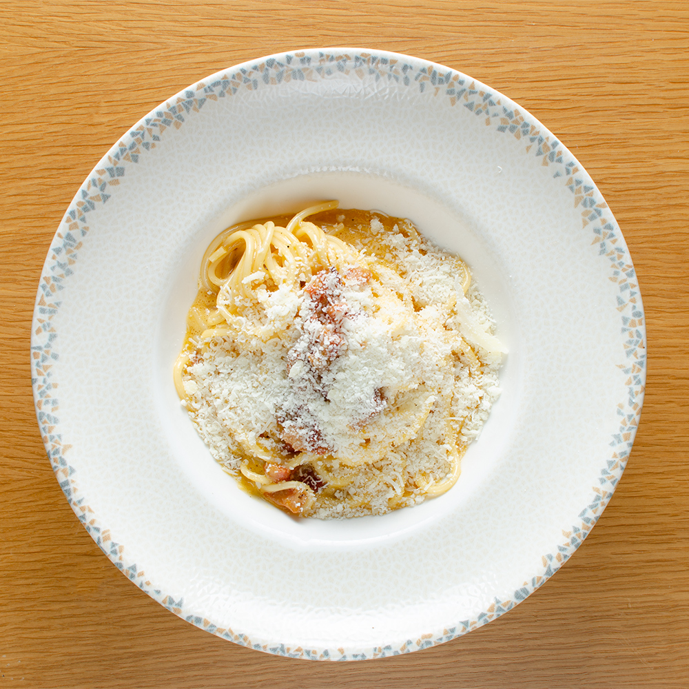 спагети, гуанчале, Пекорино Романо зряло 18 месеца, яйце, черен пипер