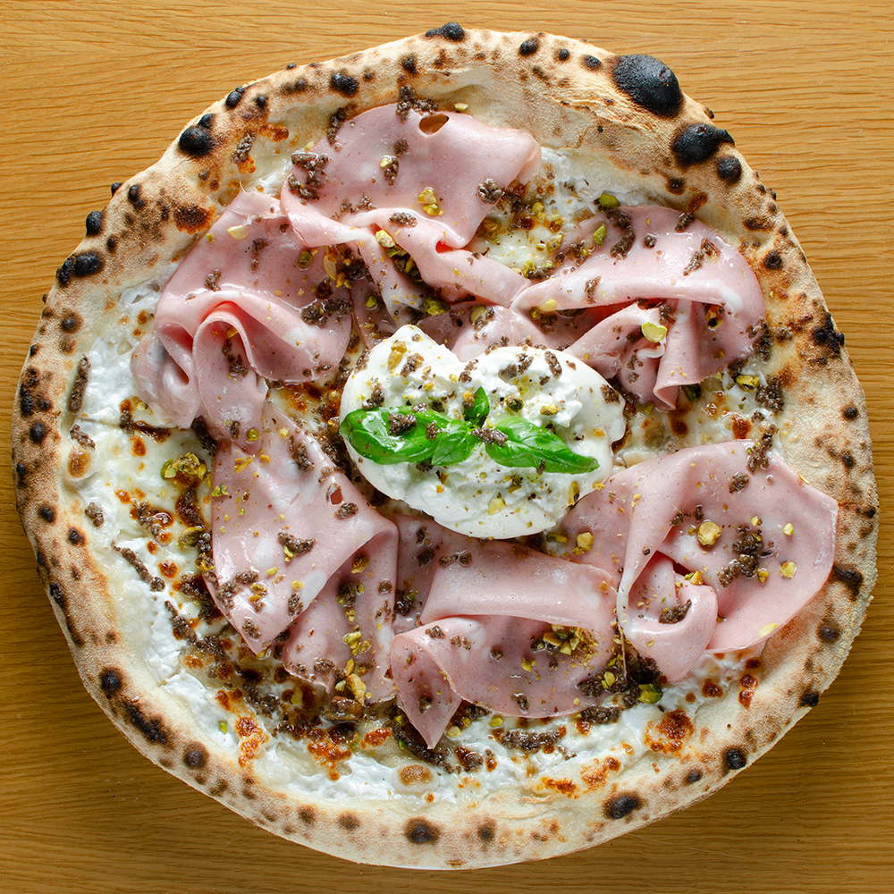 маскарпоне, моцарела Фиор ди Лате, Мортадела с трюфел, Бурата, шам фъстък, босилек, зехтин