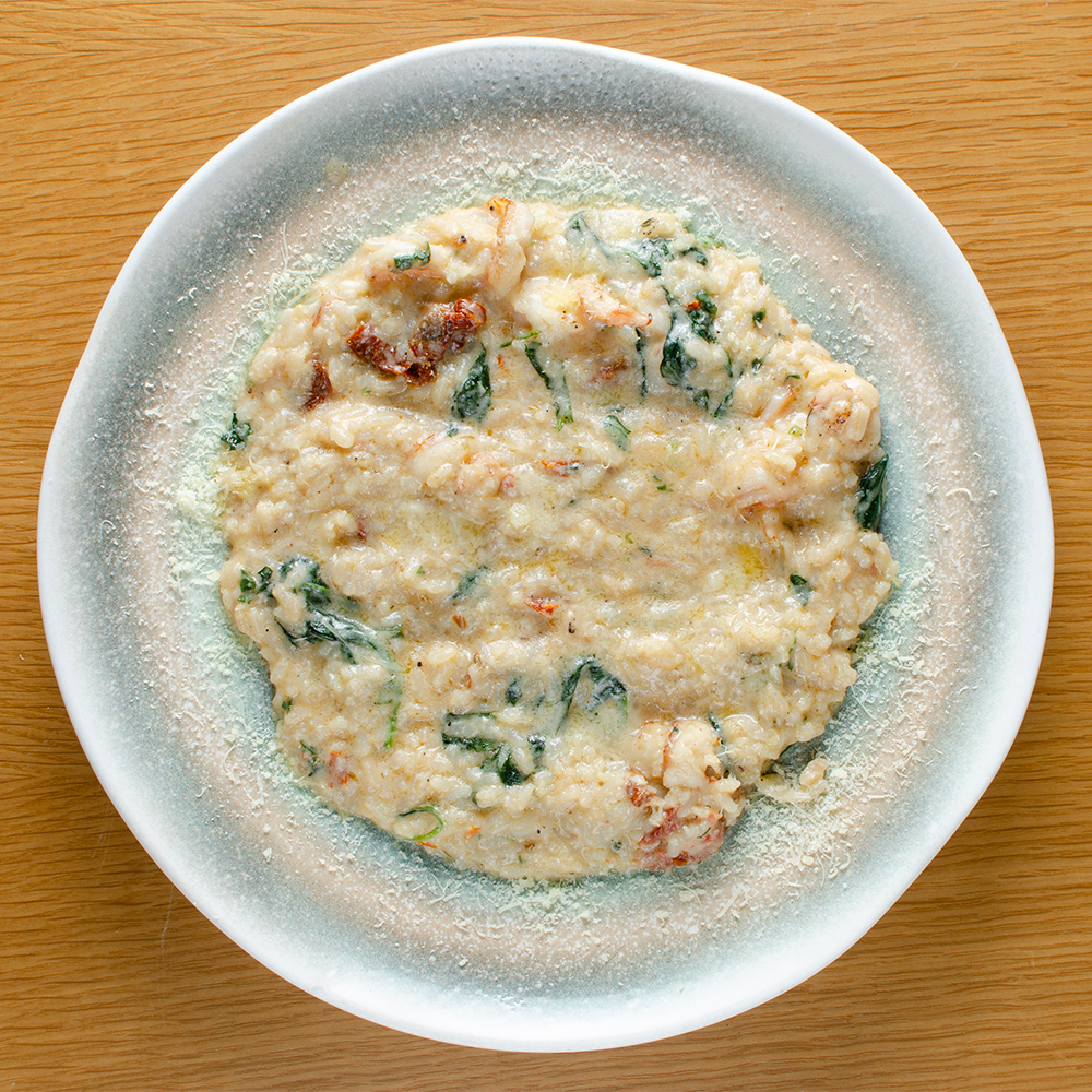 скариди, сушени домати, спанак, сметана, масло, бяло вино, зехтин, мащерка