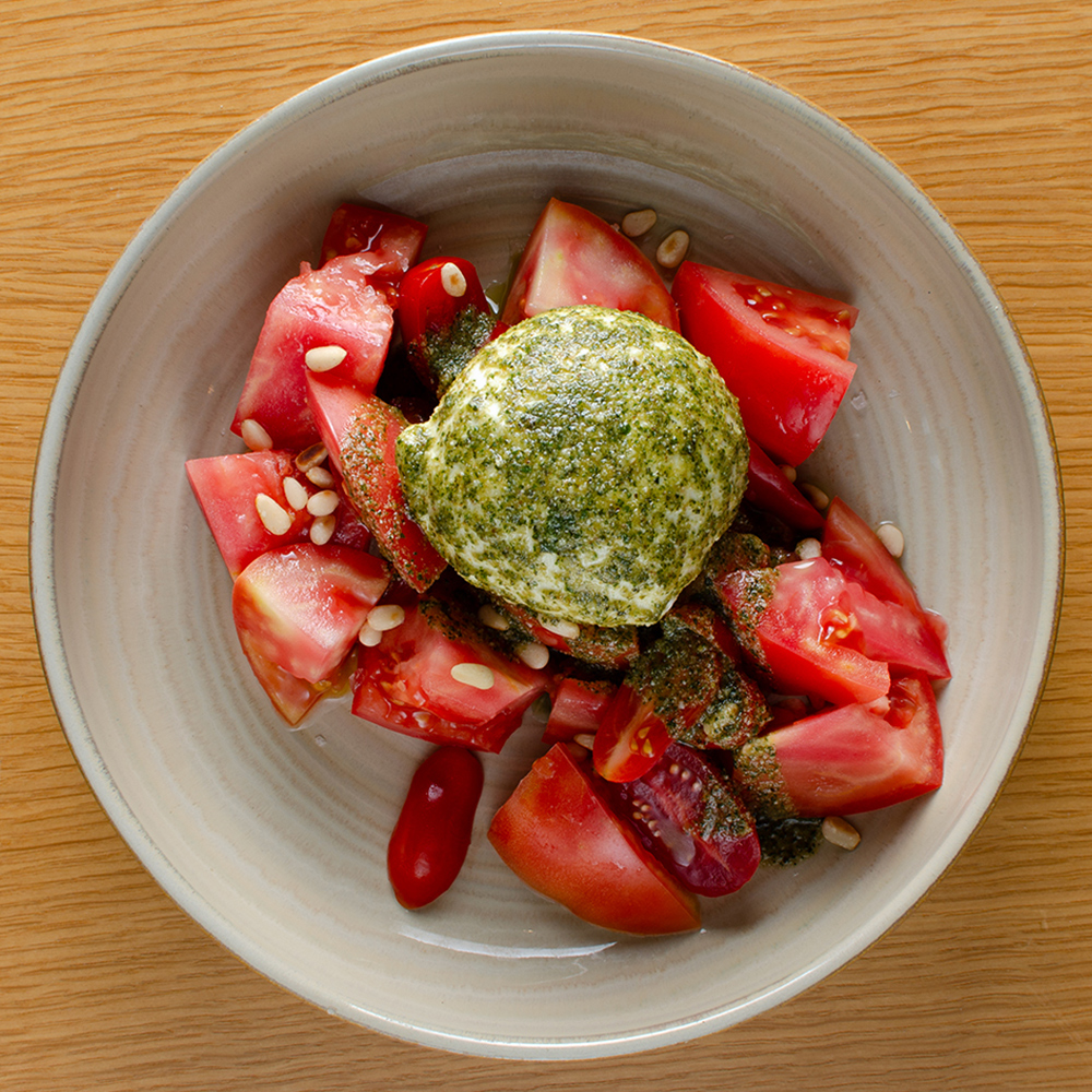 кремообразна бурата, розови и чери домати, босилек, кедрови ядки, домашно Песто