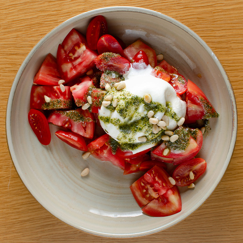 биволска моцарела, розови и чери домати, босилек, кедрови ядки, домашно Песто