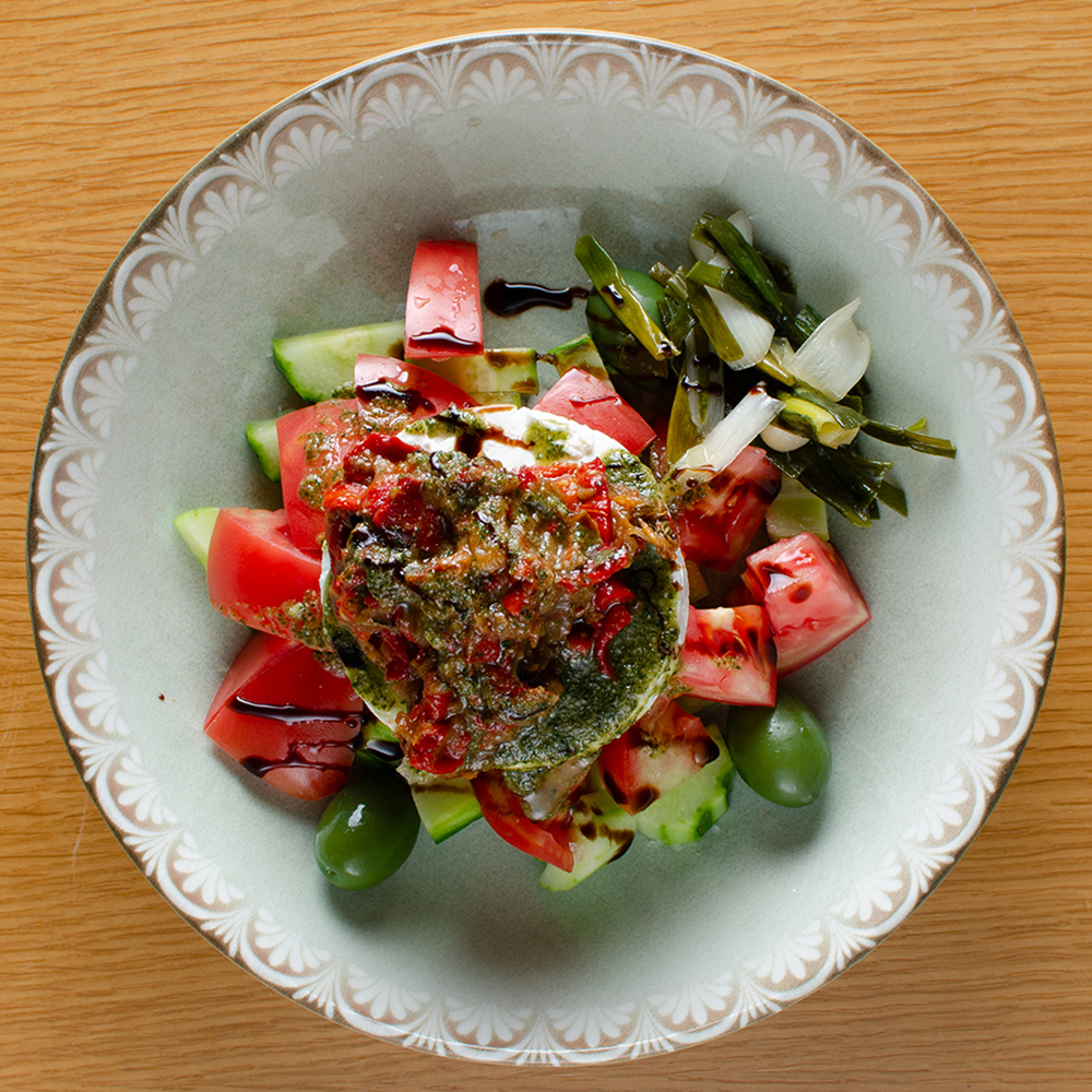 рагу от печена чушка и патладжан, домати, краставици, прясно сирене, печен зелен лук, маслини, магданоз, домашно Песто